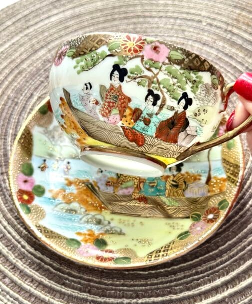 Тонка чайна чашка із блюдцем із японської порцеляни Сацума, виконана для експортного ринку Європи. Ручний надглазурний розпис з жанрової сцени: фігури в традиційних кімоно, краєвид, човен. Багате золочення, рельєфні золоті крапки (moriage).