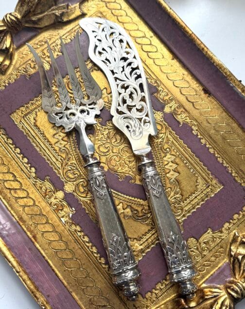Розкішний антикварний набір ХІХ ст. Франція для риби, рулетів або роздачі м’яса та закусок! Ручки зі срібла – 950 пробі, Мінерва. Неймовіно красива ювелірна робота, складне ажурне різання. Місце для монограми пусте , можна поставити родинні ініціалі ! Стан дуже класний для їх віку ,тільки малопомітні царапки на ручках , незначні дрібні вмятинки !