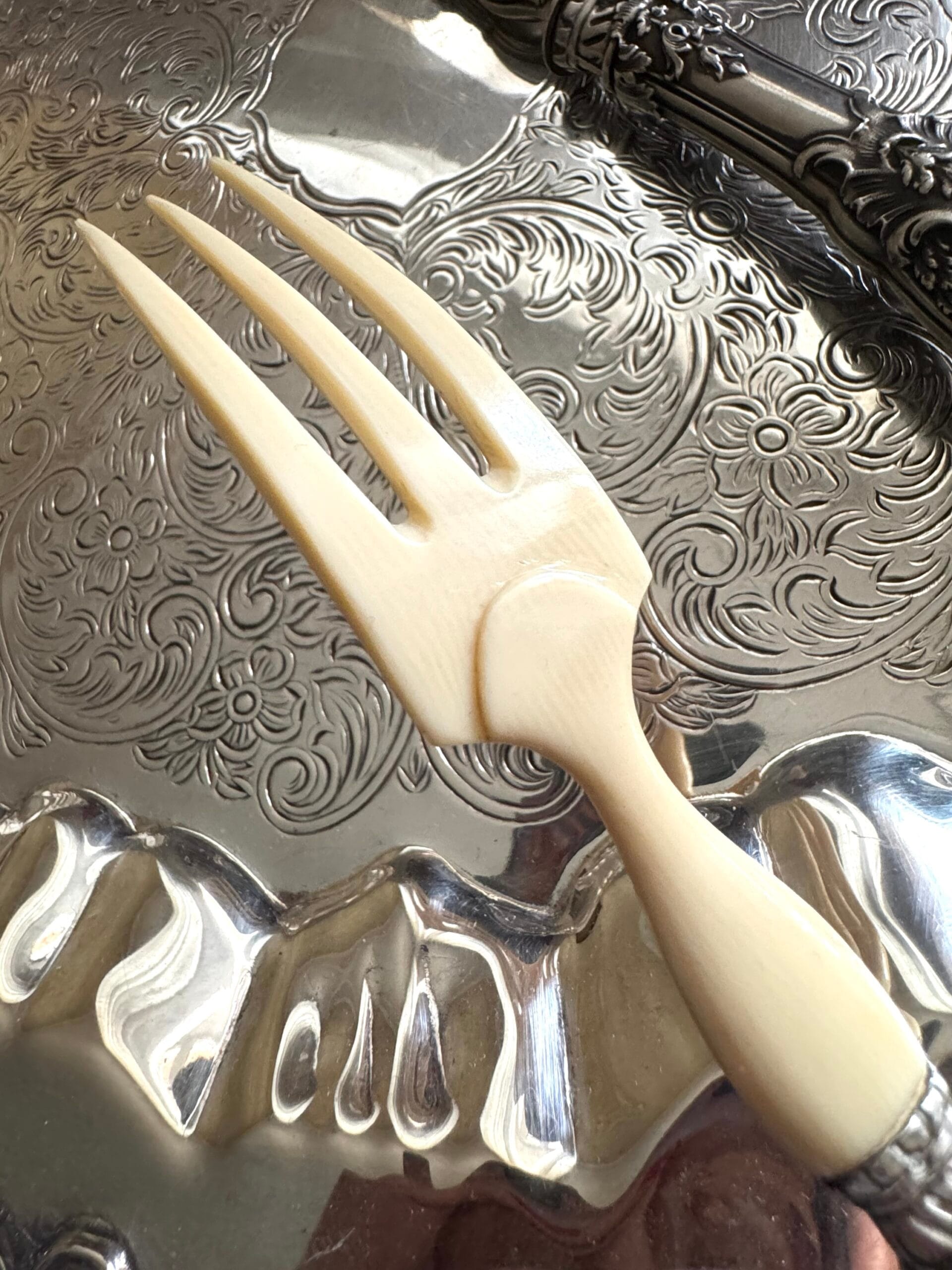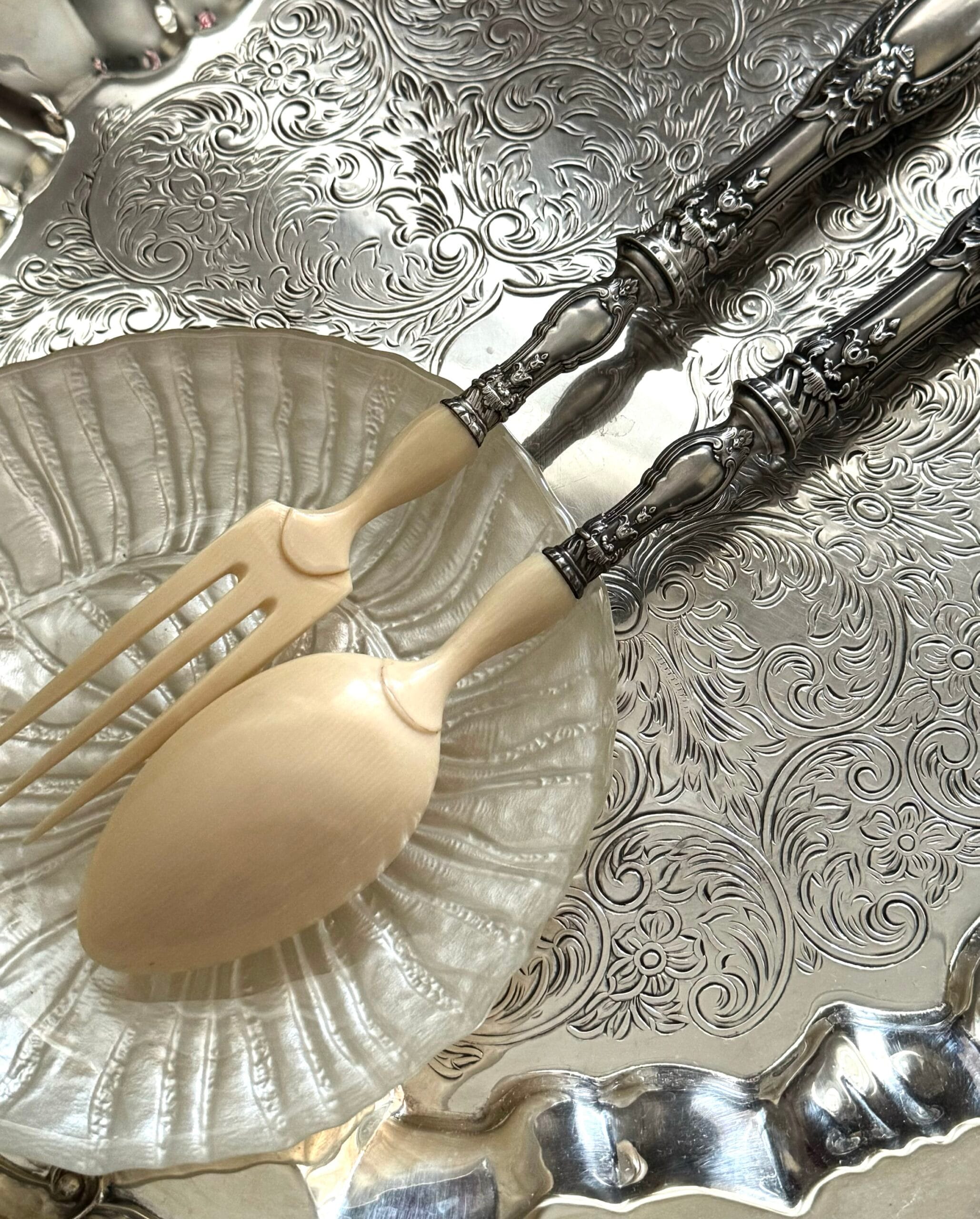 Дуже дуже гарні антикварні прибори для салату та різних закусок! Франція , 19 вік , розкішна ювелірна робота , ручки срібло 950 ° Мінерва , робочі частини натуральна кістка, довжина 29 см , відмінний стан для свого віку , без пошкоджень, тільки малопомітні незначні сліди часу у вигляді дрібних царапок від чищення , і треба ретельно почистити від патини ! Продаються в рідному кофрі !