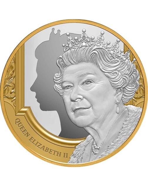 Ніуе 2022. На реверсі монети зображено прекрасний портрет її Величества королеви Єлизавети II. Королева одета в свою корону і прекрасні драгоценності. Монета має прекрасний дизайн, частково покрита золотом і поставляється в красивому футлярі разом із сертифікатом довжини. Обмежений тираж 5.000 екземплярів по всьому світу.